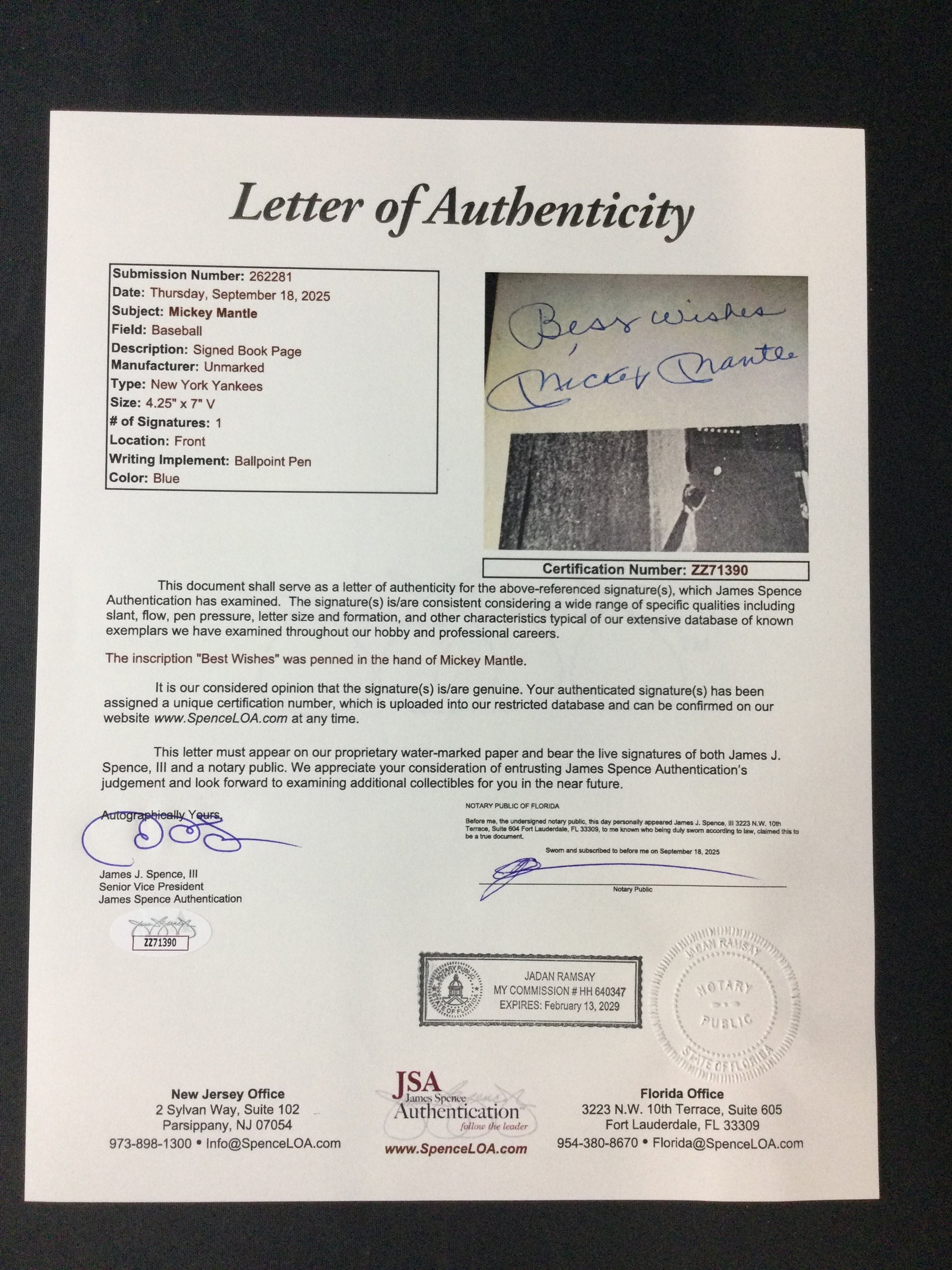 Mickey Mantle SIGNED Book Page "Best Wishes" Bold Autograph JSA LOA New York Yankees